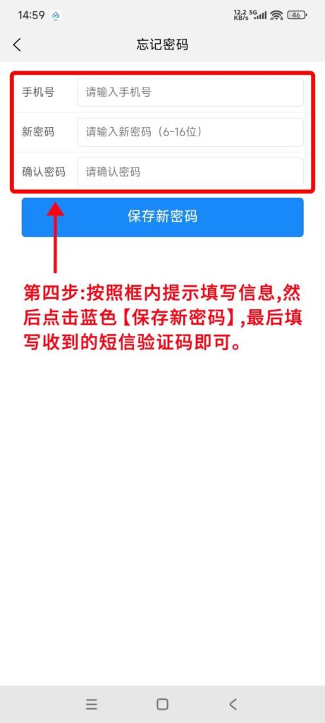 3.按照提示填写好信息,然后点击蓝色的 “保存新密码” ,最后填写收到的短信验证码即可。