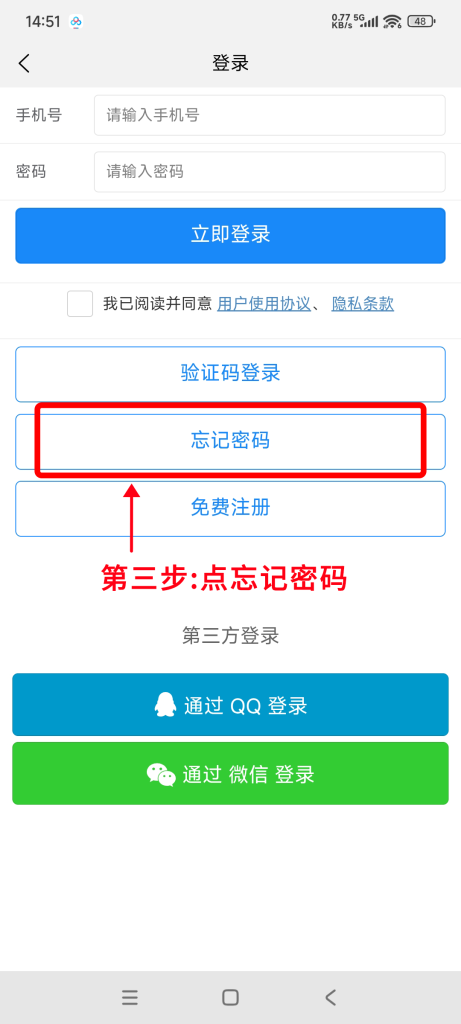 2.点击下方的 “忘记密码” 四个字,进入修改密码页面